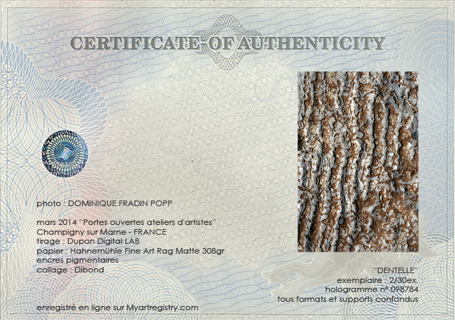 Les tirages proposées dans les formats ci-dessus, sont tirés jusqu'à 30 ex. maximum tous formats confondus accompagnés d'un certificat d'authenticité et de 2 hologrammes, un collé sur le certificat,